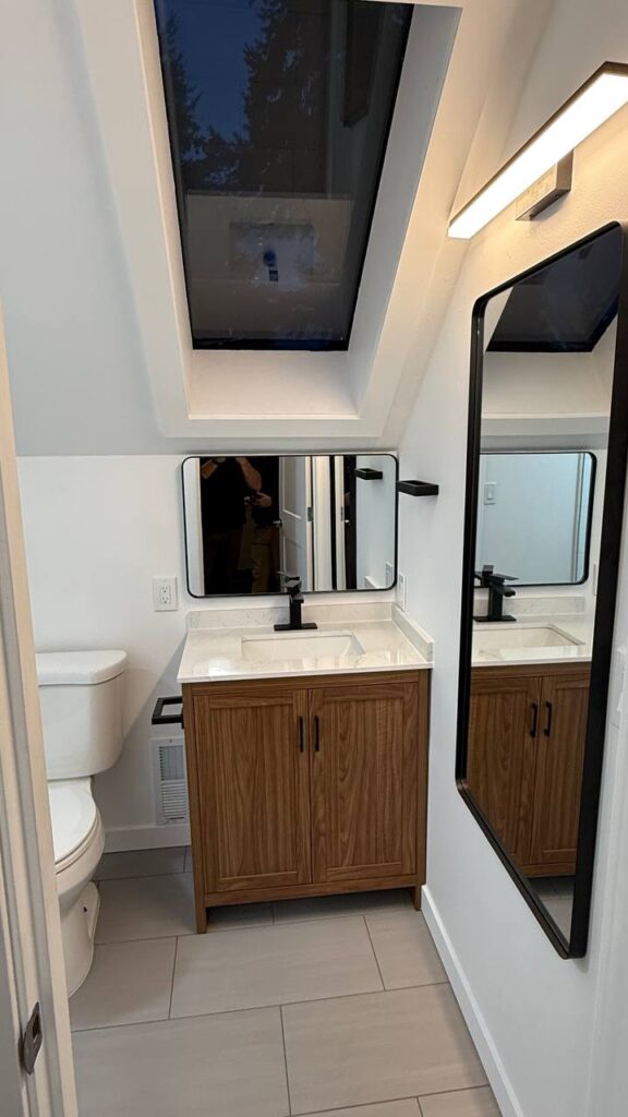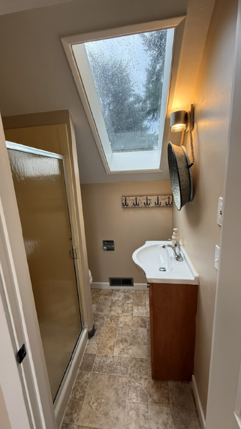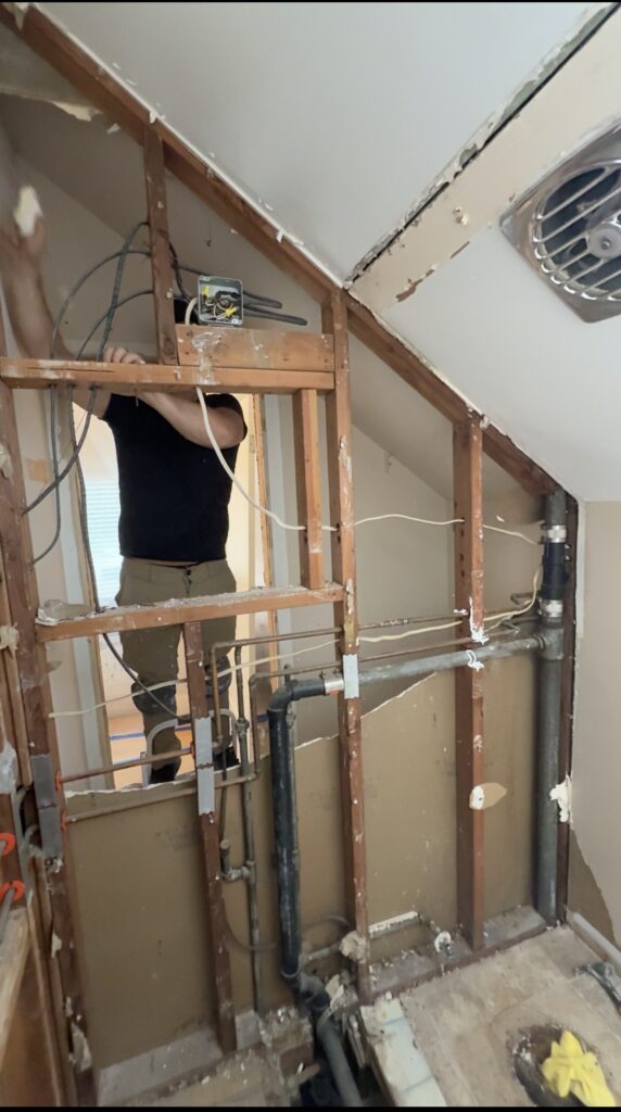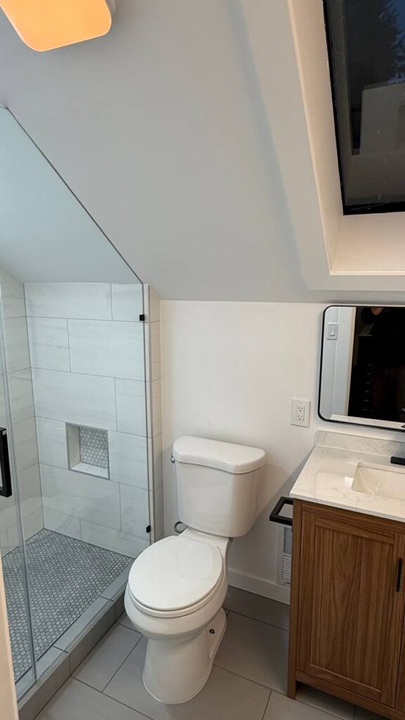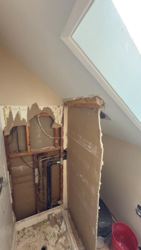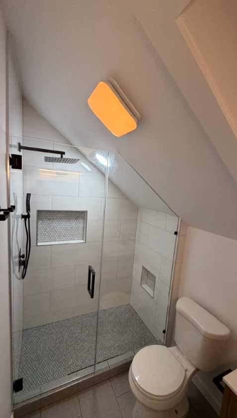 Complete renovation of the shower room: increased space by using the dressing room area, replaced and relocated plumbing fixtures, added lighting and outlets, moved the exhaust fan. Complete waterproofing of the shower area, using only high-quality materials.
